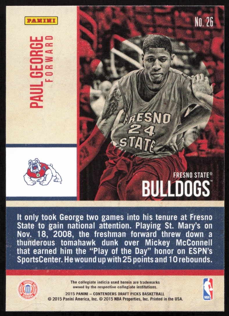 This Basketball card, from 2015-16 is part of the Panini Contenders Draft Picks card set. Paul George is featured and has a card number of 26.