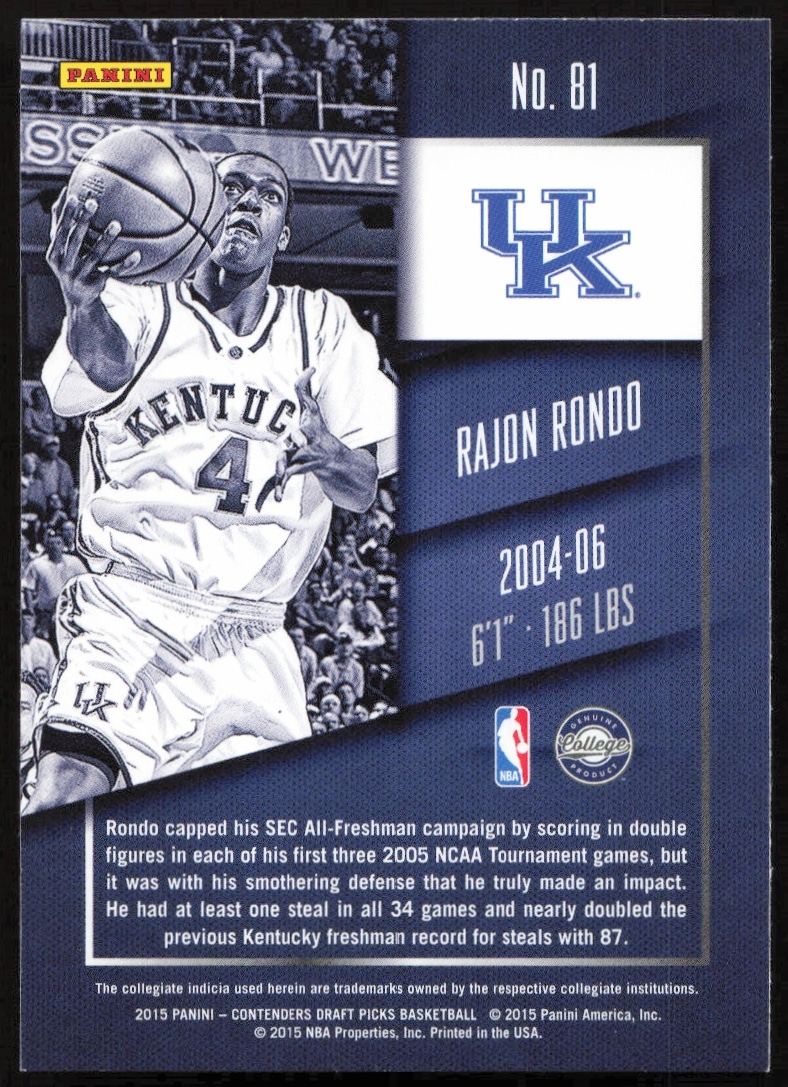 This Basketball card, from 2015-16 is part of the Panini Contenders Draft Picks card set. Rajon Rondo is featured and has a card number of 81.