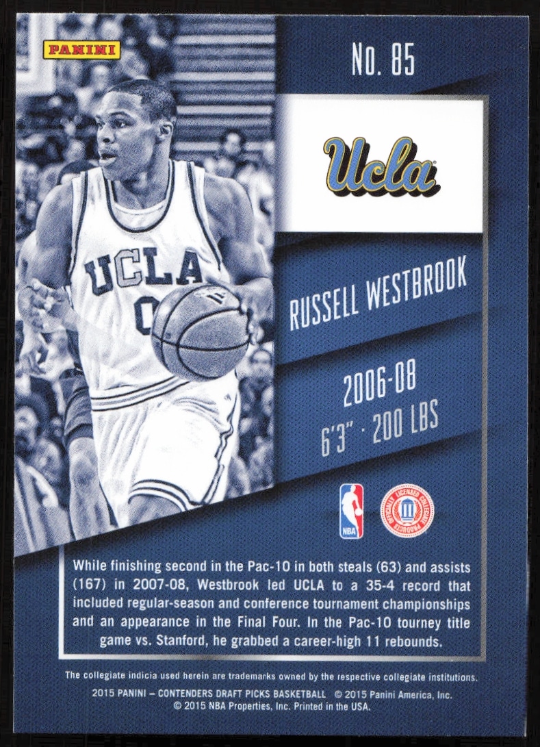 This Basketball card, from 2015-16 is part of the Panini Contenders Draft Picks card set. Russell Westbrook is featured and has a card number of 85.