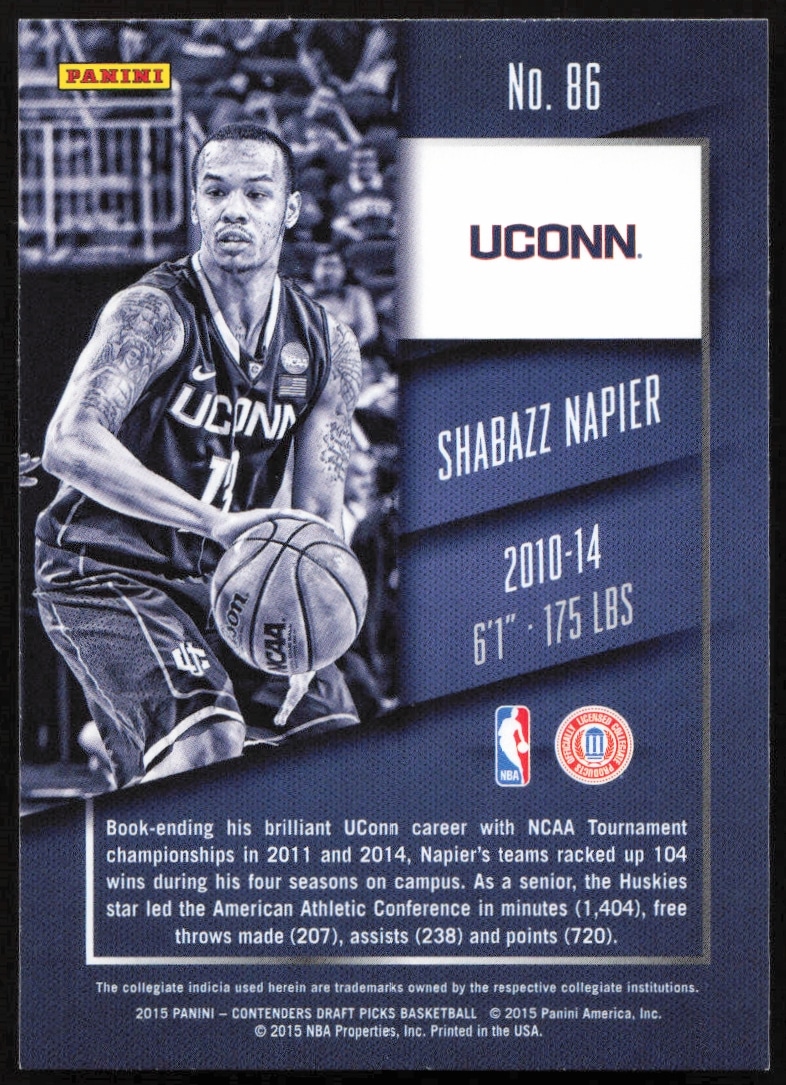 This Basketball card, from 2015-16 is part of the Panini Contenders Draft Picks card set. Shabazz Napier is featured and has a card number of 86.
