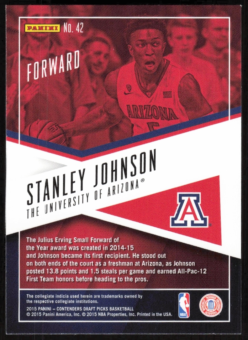 This Basketball card, from 2015-16 is part of the Panini Contenders Draft Picks card set. Stanley Johnson is featured and has a card number of 42.