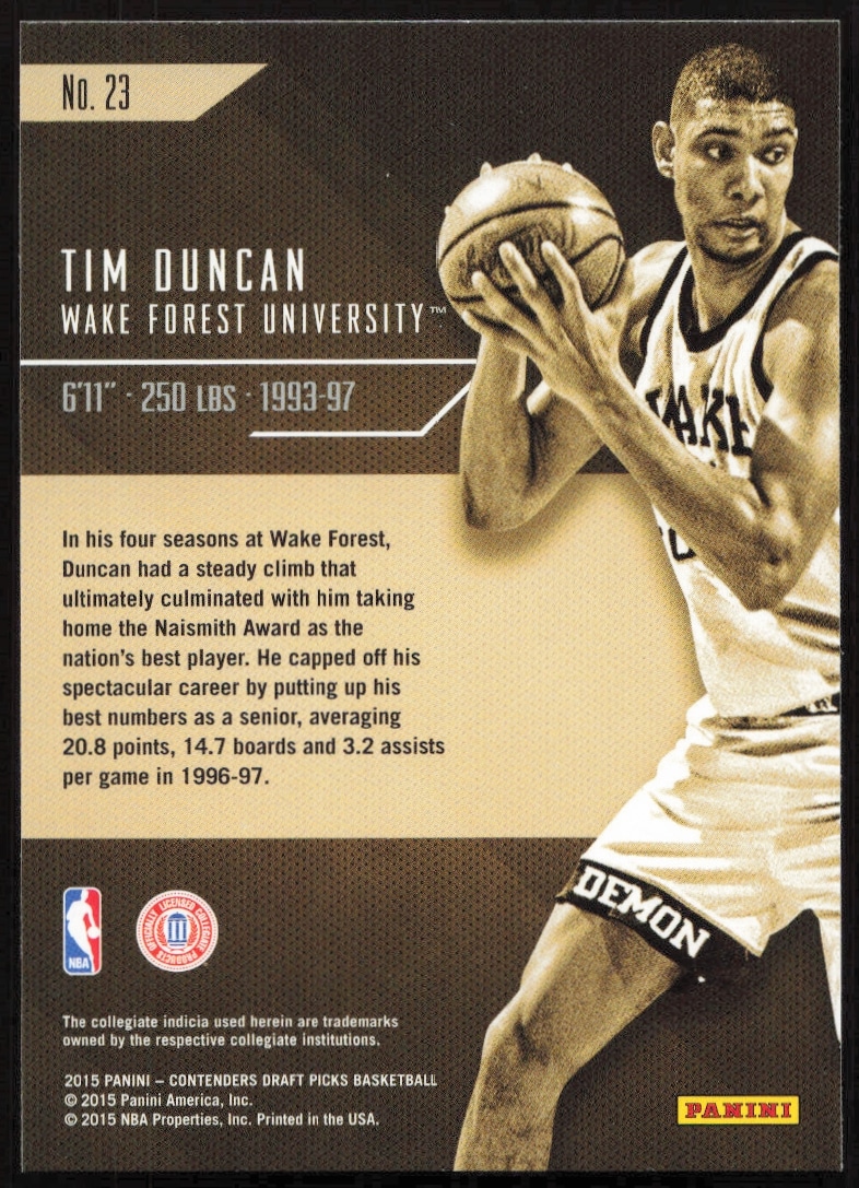 This Basketball card, from 2015-16 is part of the Panini Contenders Draft Picks card set. Tim Duncan is featured and has a card number of 23.