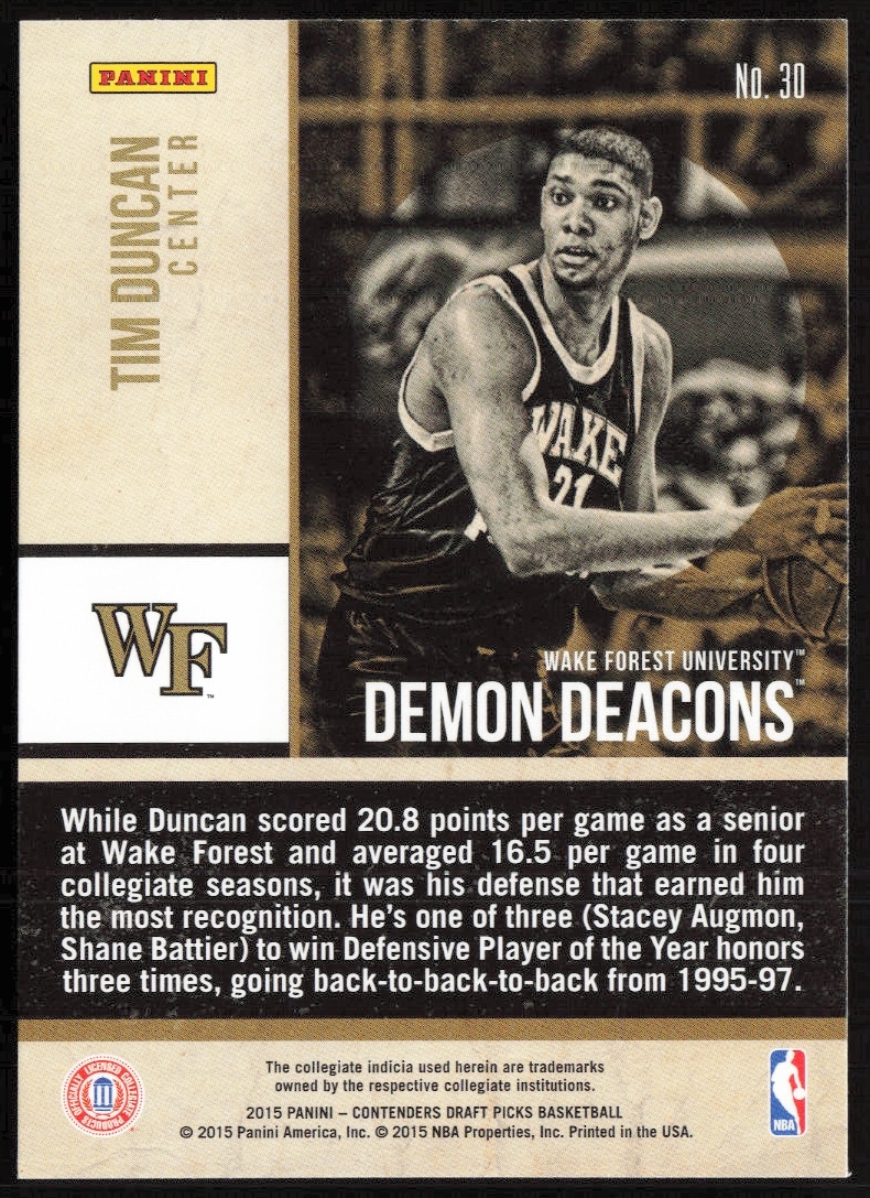 This Basketball card, from 2015-16 is part of the Panini Contenders Draft Picks card set. Tim Duncan is featured and has a card number of 30.