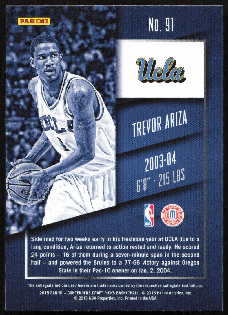 This Basketball card, from 2015-16 is part of the Panini Contenders Draft Picks card set. Trevor Ariza is featured and has a card number of 91.