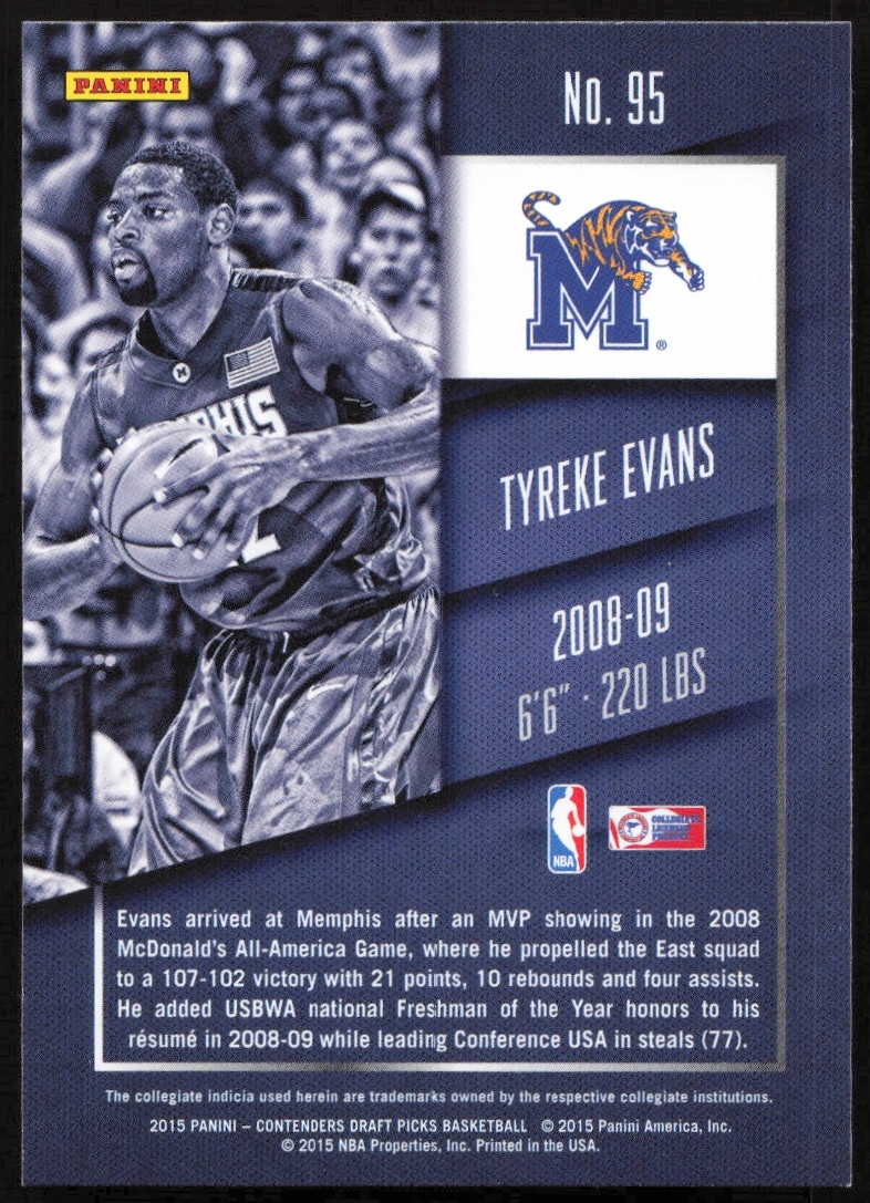 This Basketball card, from 2015-16 is part of the Panini Contenders Draft Picks card set. Tyreke Evans is featured and has a card number of 95.