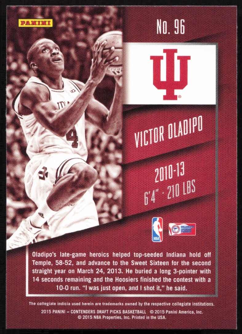 This Basketball card, from 2015-16 is part of the Panini Contenders Draft Picks card set. Victor Oladipo is featured and has a card number of 96.