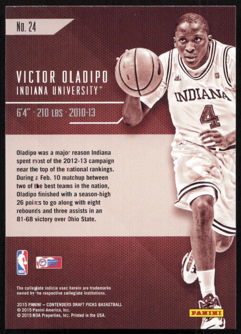 This Basketball card, from 2015-16 is part of the Panini Contenders Draft Picks card set. Victor Oladipo is featured and has a card number of 24.