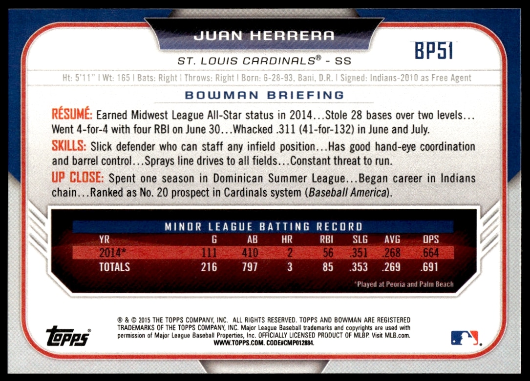 This Baseball card, from 2015 is part of the Bowman Draft card set. Juan Herrera is featured and has a card number of BP51.