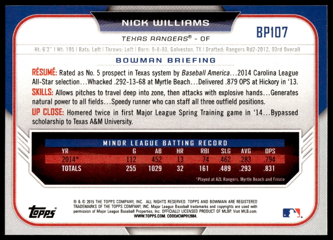 This Baseball card, from 2015 is part of the Bowman Draft card set. Nick Williams is featured and has a card number of BP107.