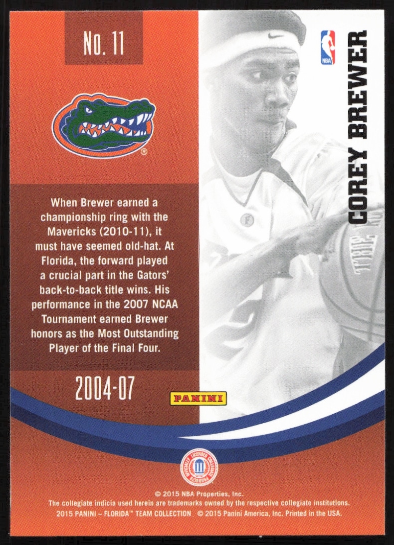 This Basketball card, from 2015 is part of the Panini Florida Gators card set. Corey Brewer is featured and has a card number of 11.