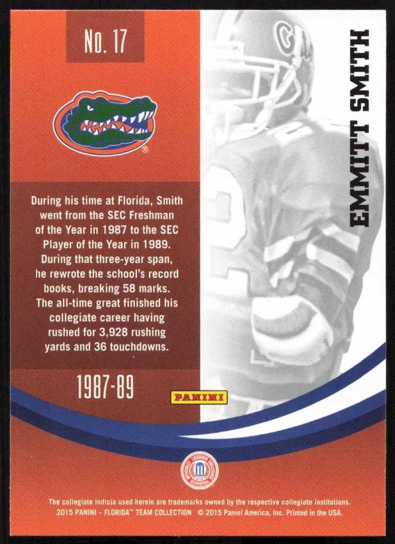 This Football card, from 2015 is part of the Panini Florida Gators card set. Emmitt Smith is featured and has a card number of 17.