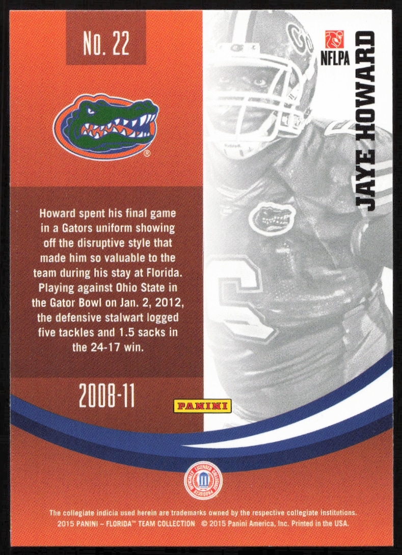 This Football card, from 2015 is part of the Panini Florida Gators card set. Jaye Howard is featured and has a card number of 22.