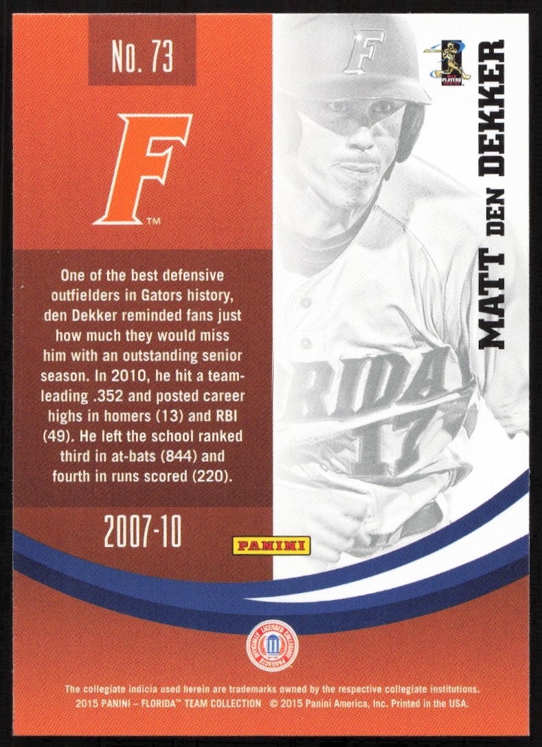 This Baseball card, from 2015 is part of the Panini Florida Gators card set. Matt Den Dekker is featured and has a card number of 73.