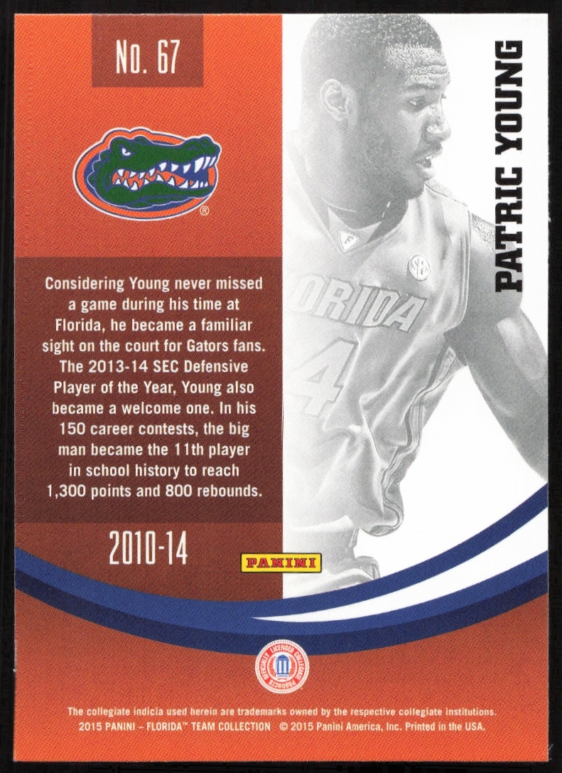 This Basketball card, from 2015 is part of the Panini Florida Gators card set. Patric Young is featured and has a card number of 67.
