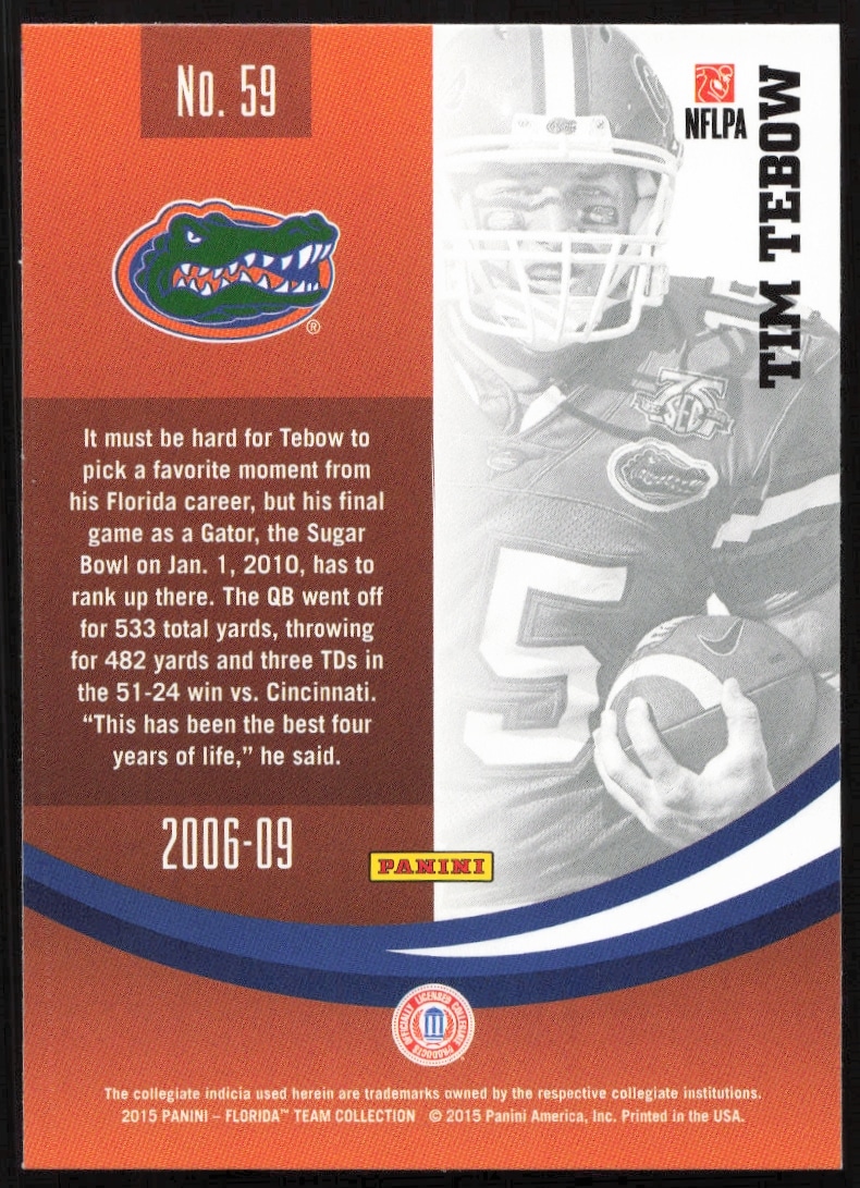 This Football card, from 2015 is part of the Panini Florida Gators card set. Tim Tebow is featured and has a card number of 59.