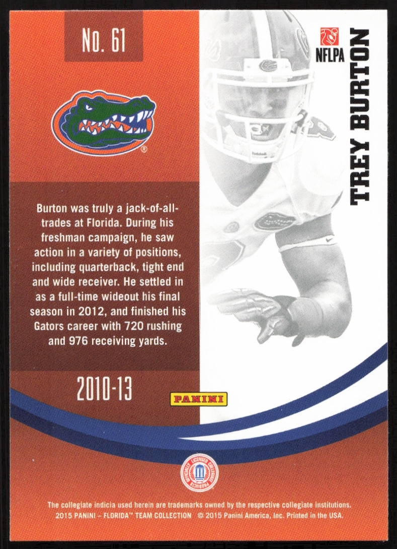 This Football card, from 2015 is part of the Panini Florida Gators card set. Trey Burton is featured and has a card number of 61.