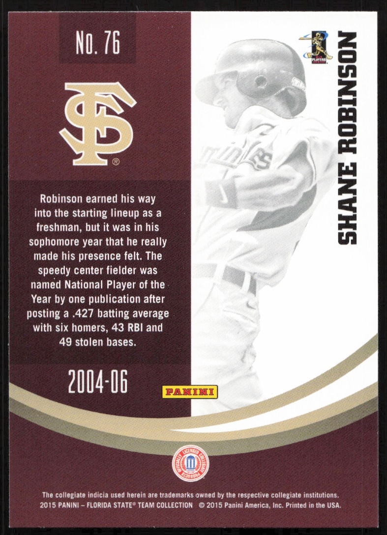 This Baseball card, from 2015 is part of the Panini Florida State Seminoles card set. Shane Fobinson is featured and has a card number of 76.