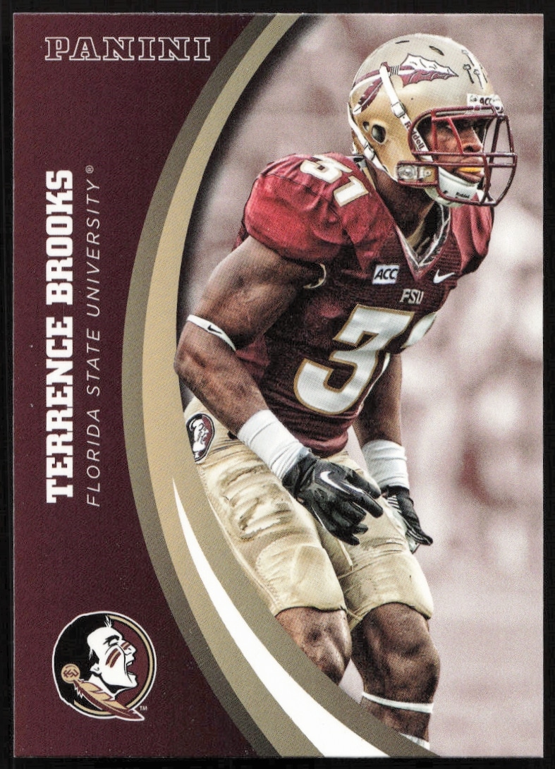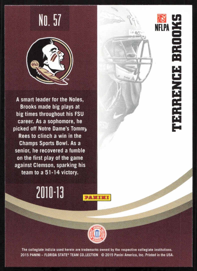 This Baseball card, from 2015 is part of the Panini Florida State Seminoles card set. Terrance Brooks is featured and has a card number of 57.