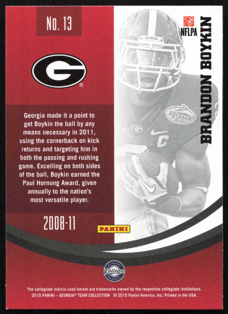This Football card, from 2015 is part of the Panini Georgia Bulldogs card set. Brandon Boykin is featured and has a card number of 13.