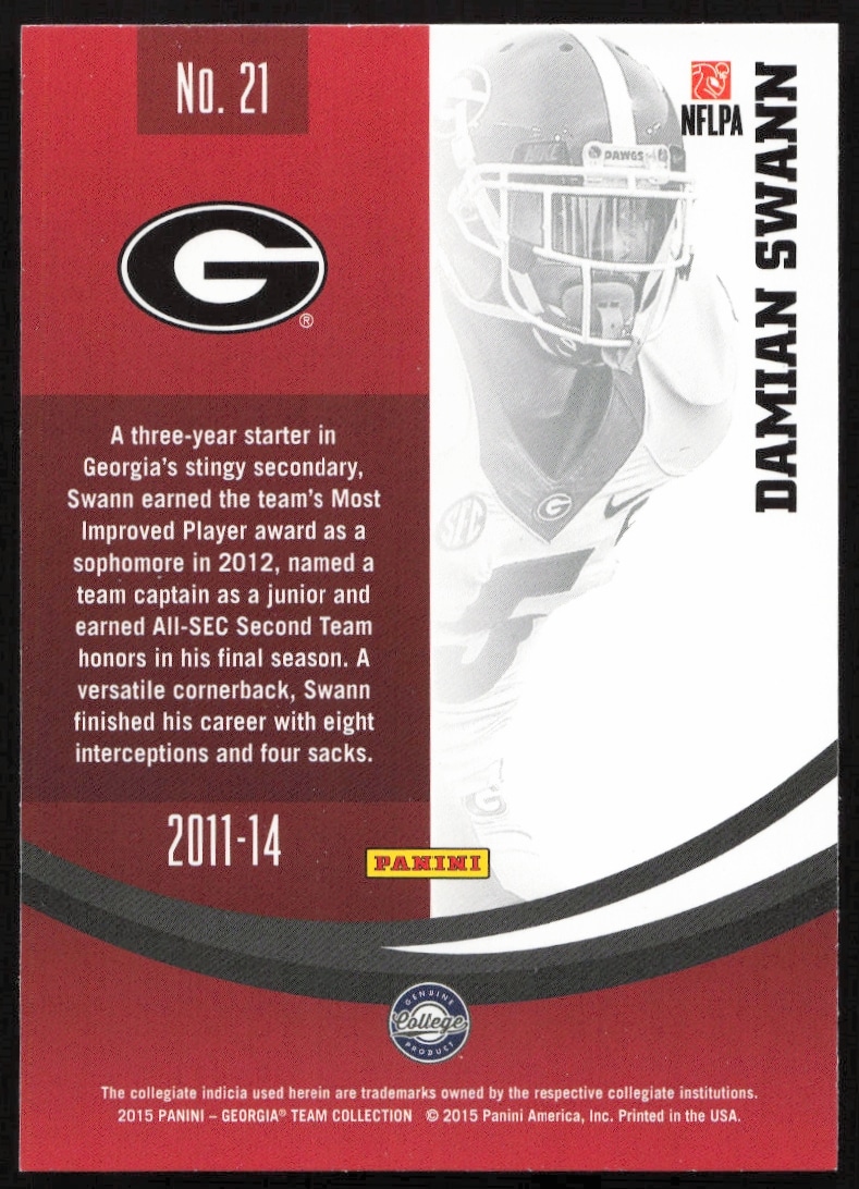 This Football card, from 2015 is part of the Panini Georgia Bulldogs card set. Damian Swann is featured and has a card number of 21.