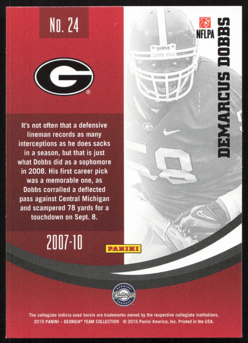 This Football card, from 2015 is part of the Panini Georgia Bulldogs card set. Demarcus Dobbs is featured and has a card number of 24.
