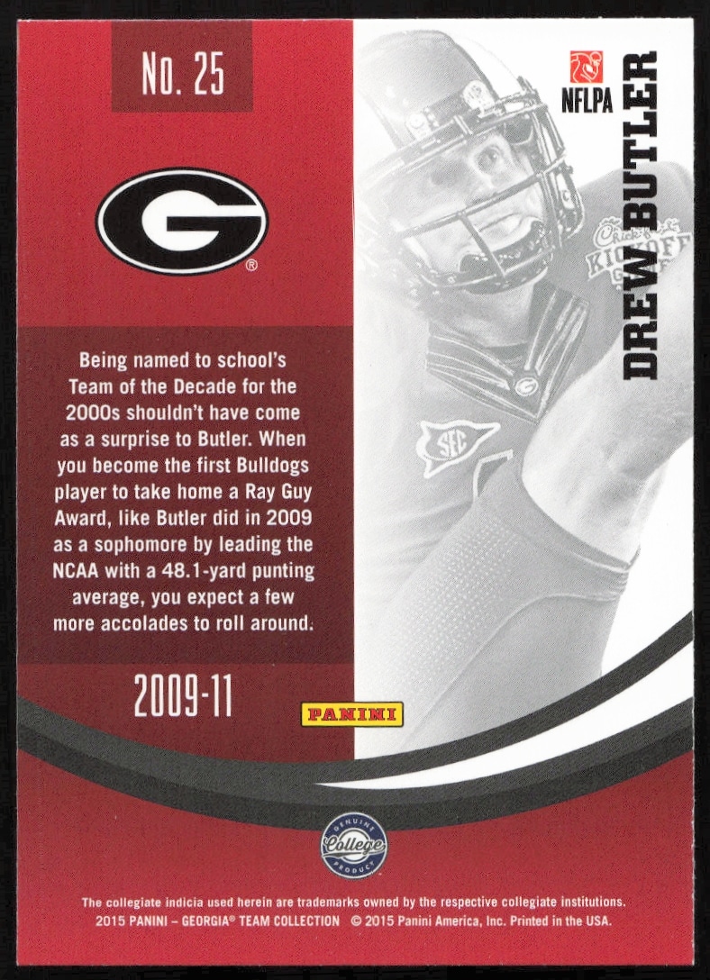 This Football card, from 2015 is part of the Panini Georgia Bulldogs card set. Drew Butter is featured and has a card number of 25.