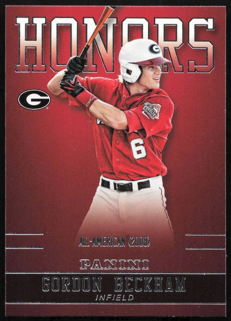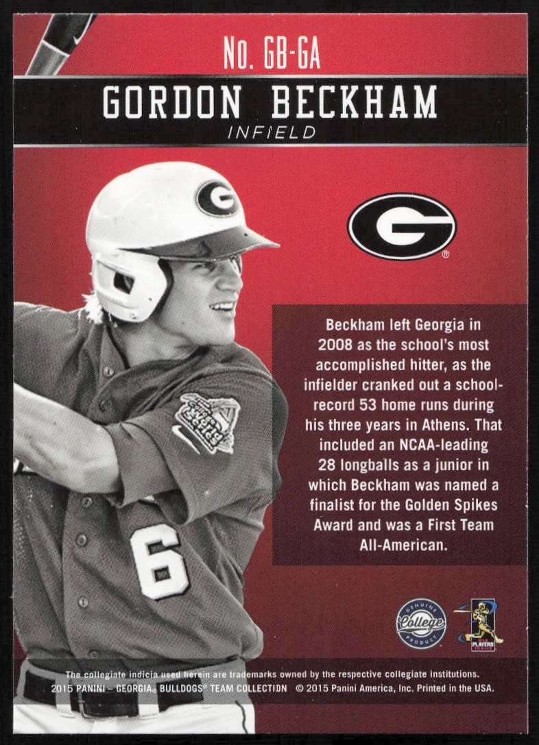 This Baseball card, from 2015 is part of the Panini Georgia Bulldogs card set. Gordon Beckham is featured and has a card number of GB-GA.