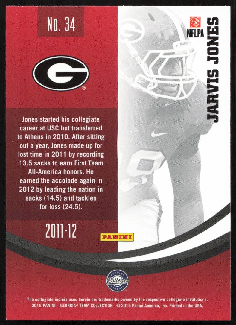 This Football card, from 2015 is part of the Panini Georgia Bulldogs card set. Jarvis Jones is featured and has a card number of 34.