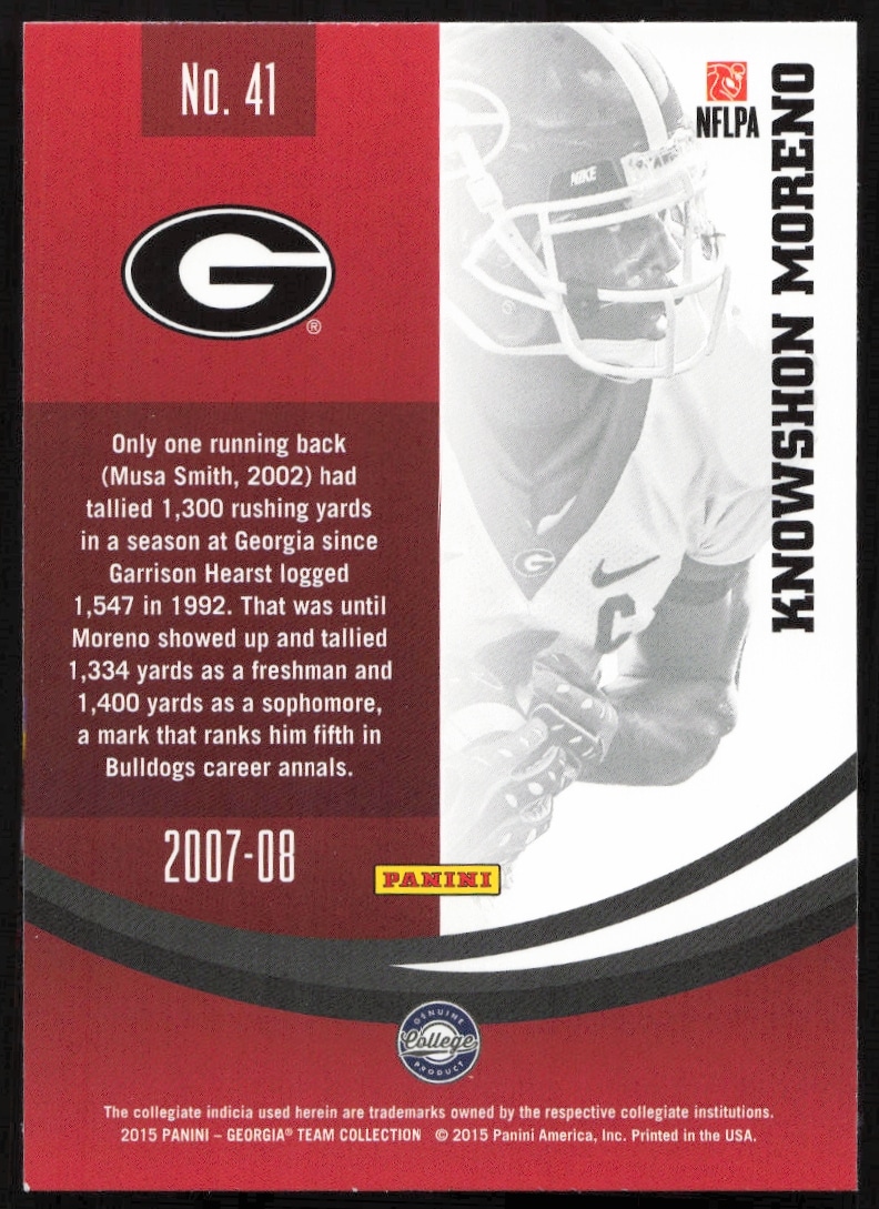 This Football card, from 2015 is part of the Panini Georgia Bulldogs card set. Knowshon Moreno is featured and has a card number of 41.