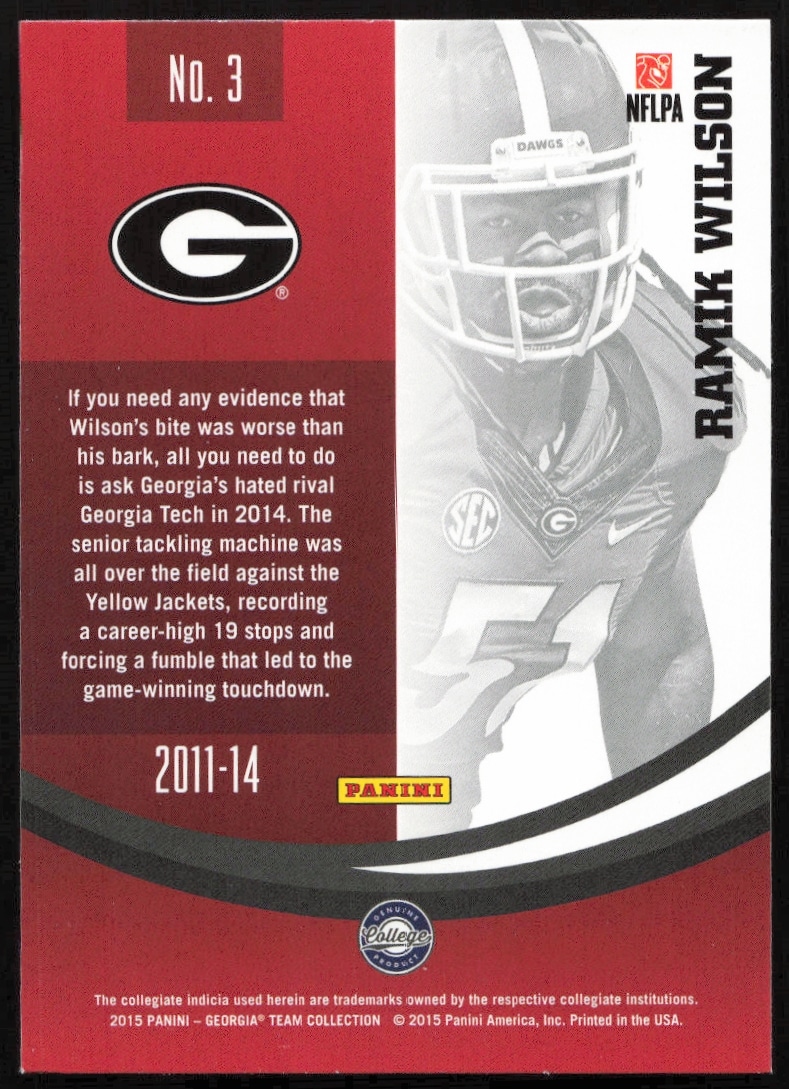 This Football card, from 2015 is part of the Panini Georgia Bulldogs card set. Ramik Wilson is featured and has a card number of 3.