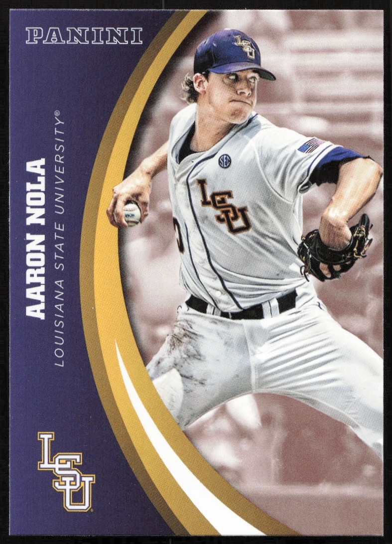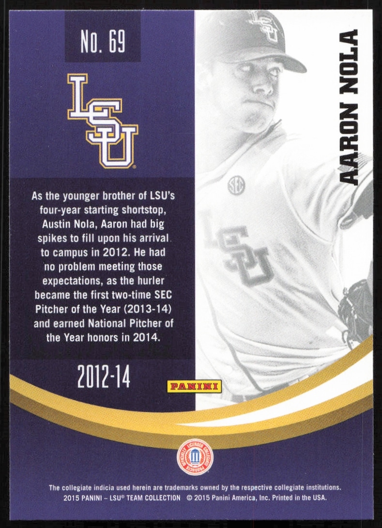 This Baseball card, from 2015 is part of the Panini LSU Tigers card set. Aaron Nola is featured and has a card number of 69.