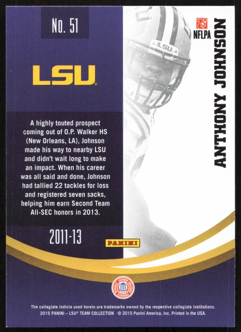 This Football card, from 2015 is part of the Panini LSU Tigers card set. Anthony Johnson is featured and has a card number of 51.