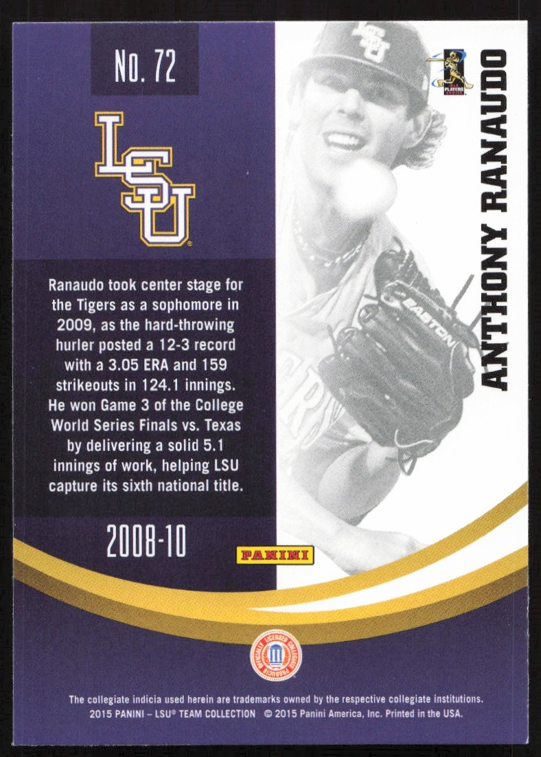 This Baseball card, from 2015 is part of the Panini LSU Tigers card set. Anthony Ranaudo is featured and has a card number of 72.