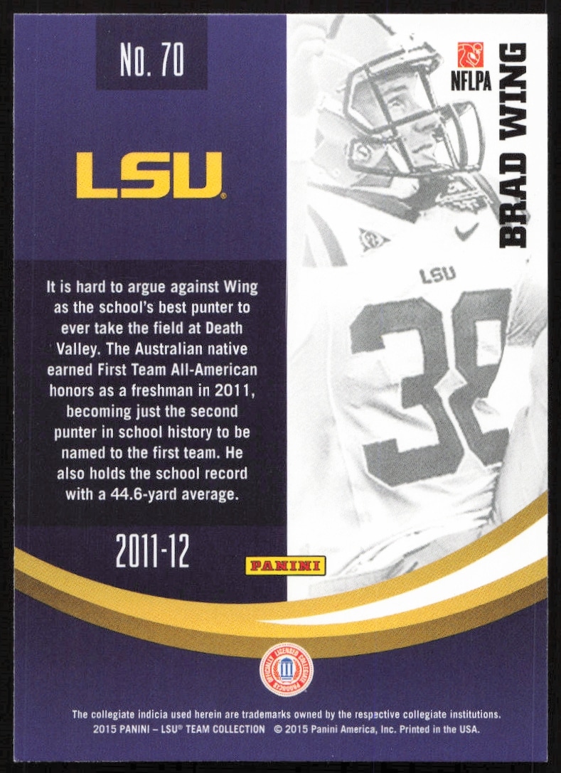 This Football card, from 2015 is part of the Panini LSU Tigers card set. Brad Wing is featured and has a card number of 70.