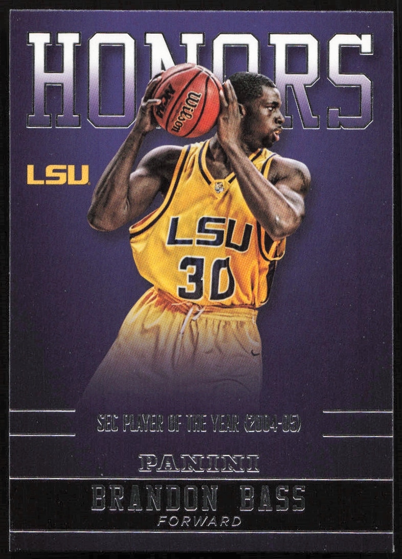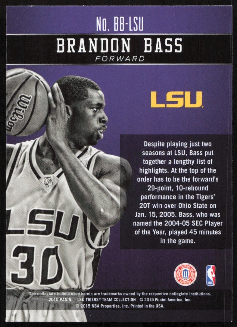 This Basketball card, from 2015 is part of the Panini LSU Tigers card set. Brandon Bass is featured and has a card number of BB-LSU.