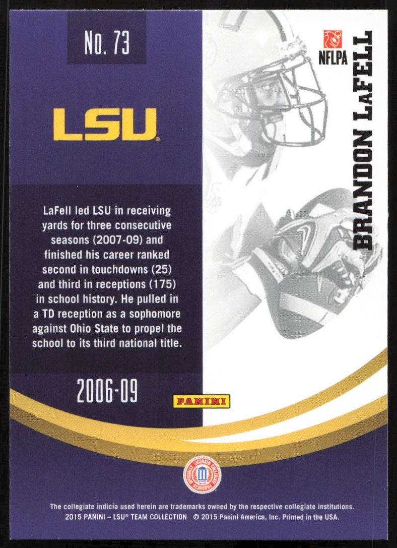 This Football card, from 2015 is part of the Panini LSU Tigers card set. Brandon LaFell is featured and has a card number of 73.