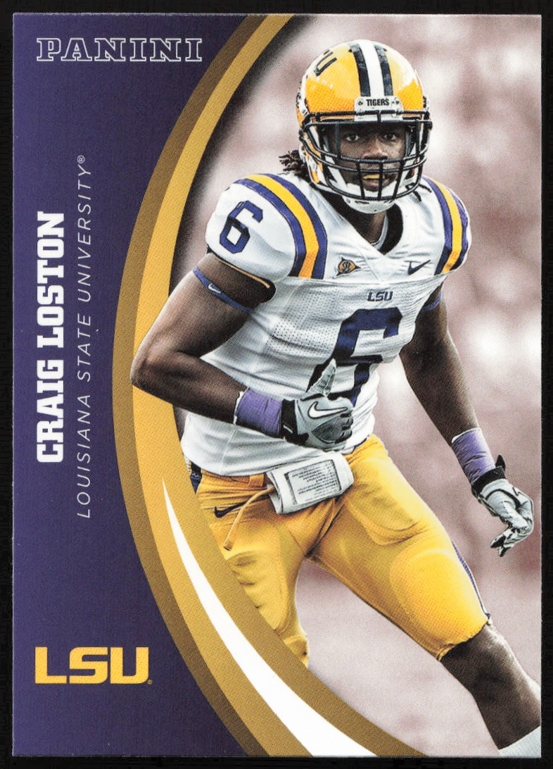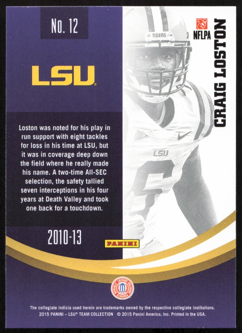 This Football card, from 2015 is part of the Panini LSU Tigers card set. Craig Loston is featured and has a card number of 12.