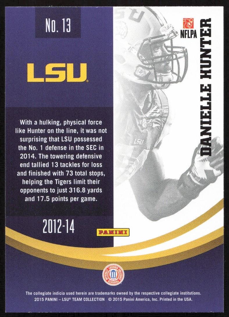 This Football card, from 2015 is part of the Panini LSU Tigers card set. Danielle Hunter is featured and has a card number of 13.