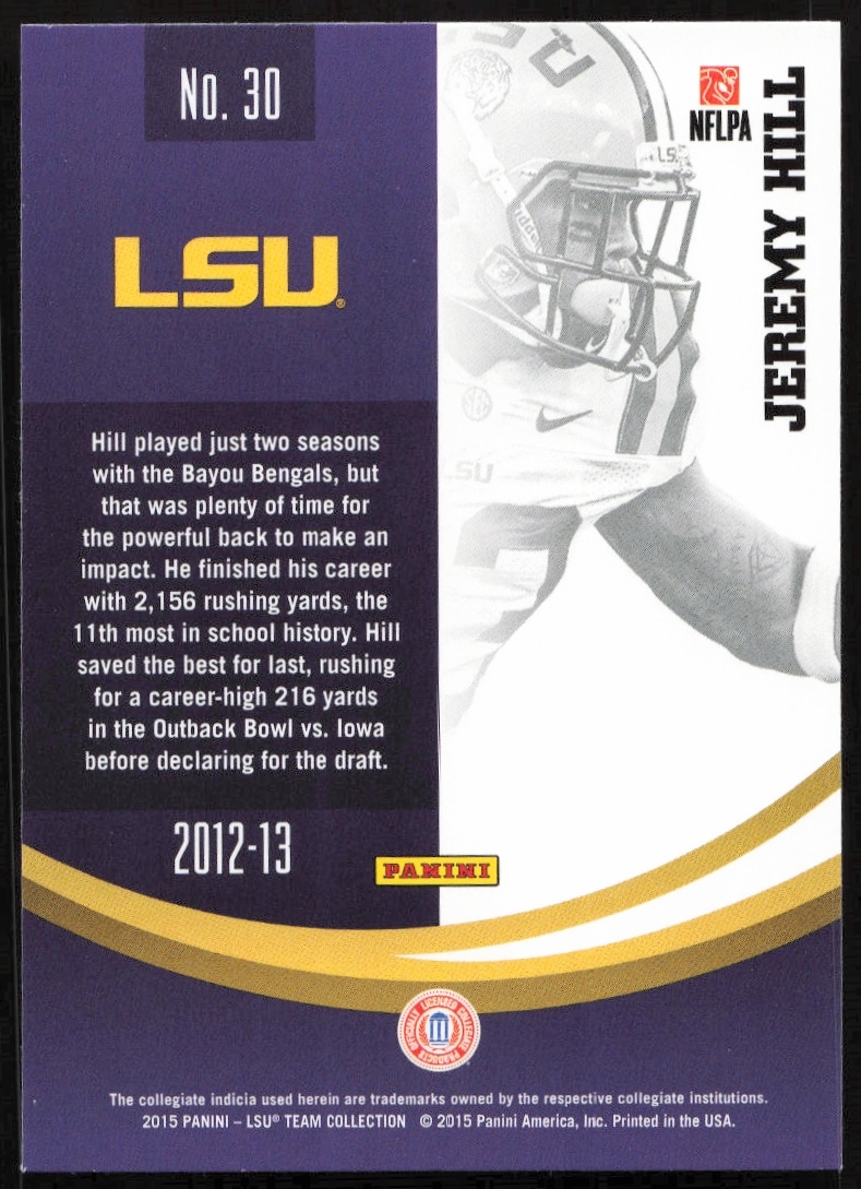 This Football card, from 2015 is part of the Panini LSU Tigers card set. Jeremy Hill is featured and has a card number of 30.