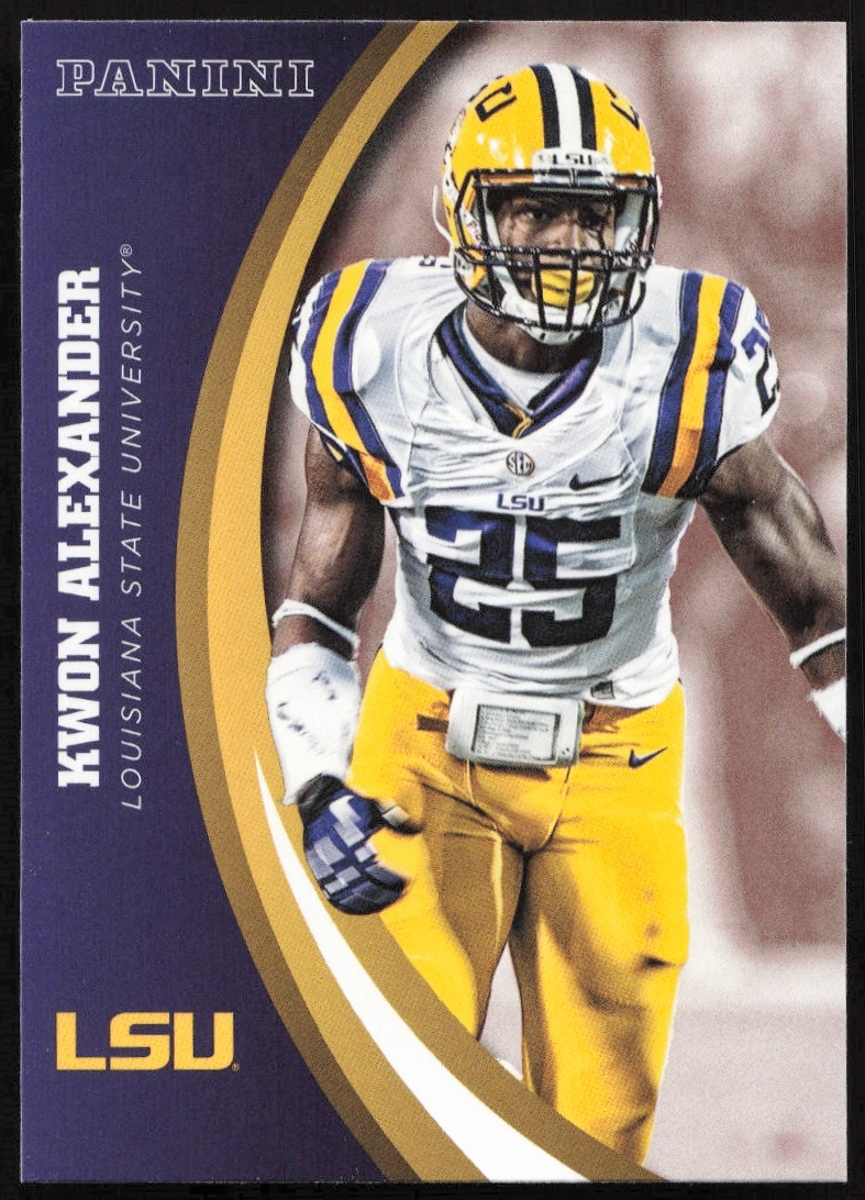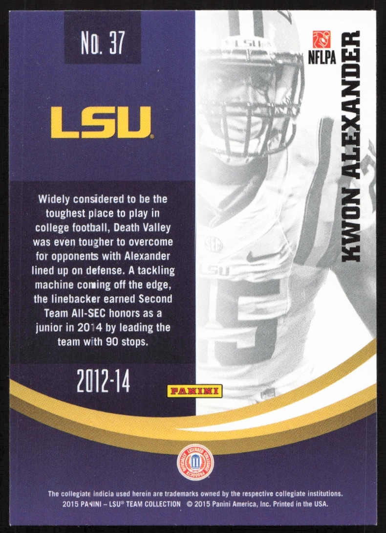 This Football card, from 2015 is part of the Panini LSU Tigers card set. Kwon Alexander is featured and has a card number of 37.