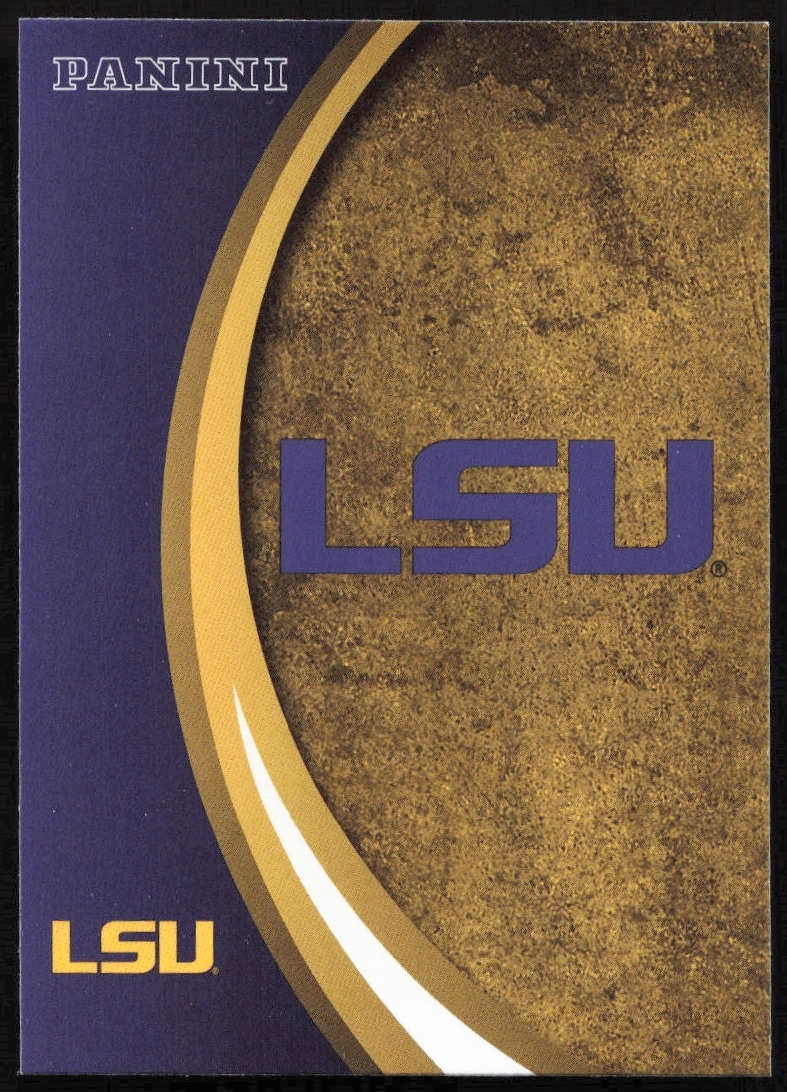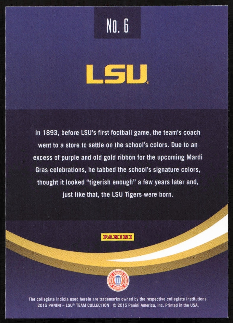 This card, from 2015 is part of the Panini LSU Tigers card set. The LSU Logo is featured and has a card number of 6.