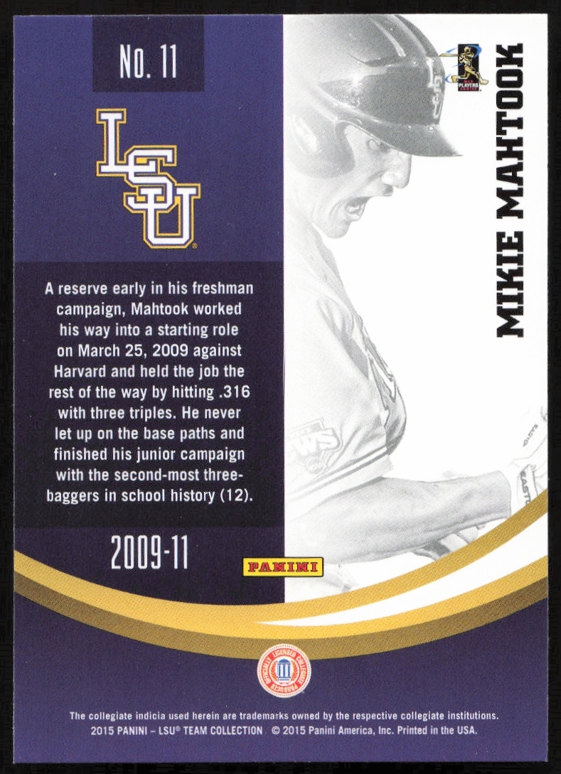 This Baseball card, from 2015 is part of the Panini LSU Tigers card set. Mikie Mahtook is featured and has a card number of 11.