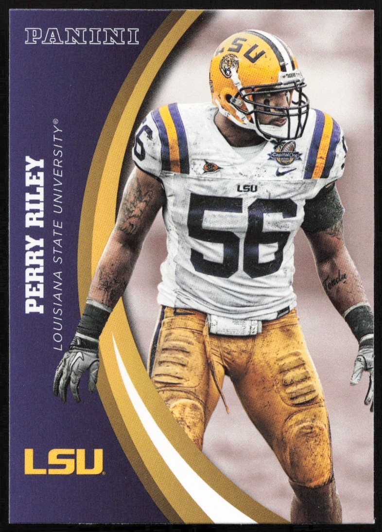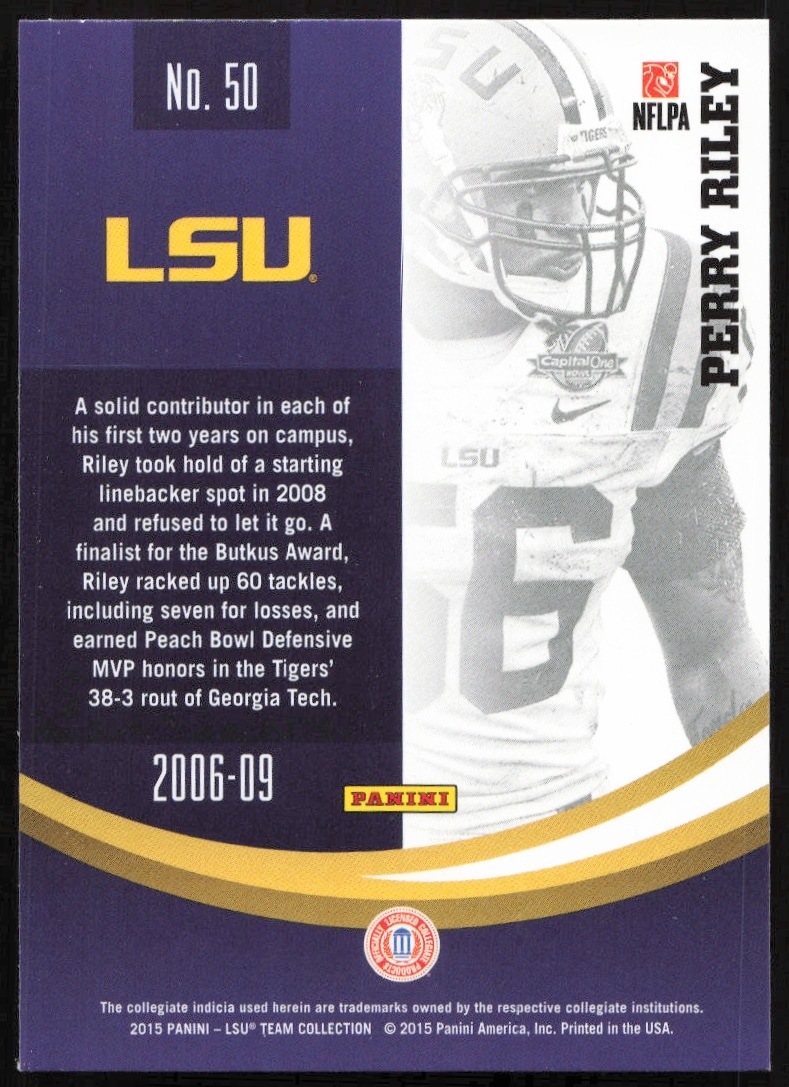 This Football card, from 2015 is part of the Panini LSU Tigers card set. Perry Riley is featured and has a card number of 50.
