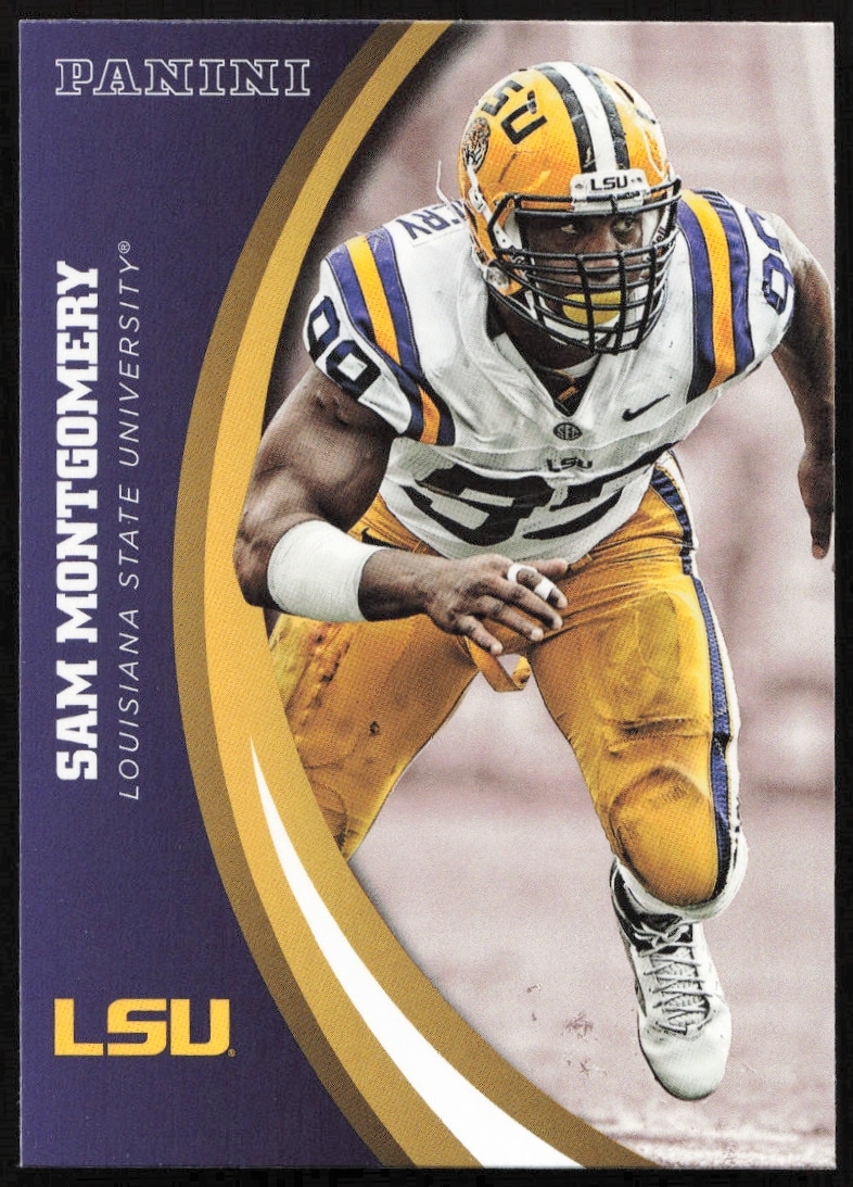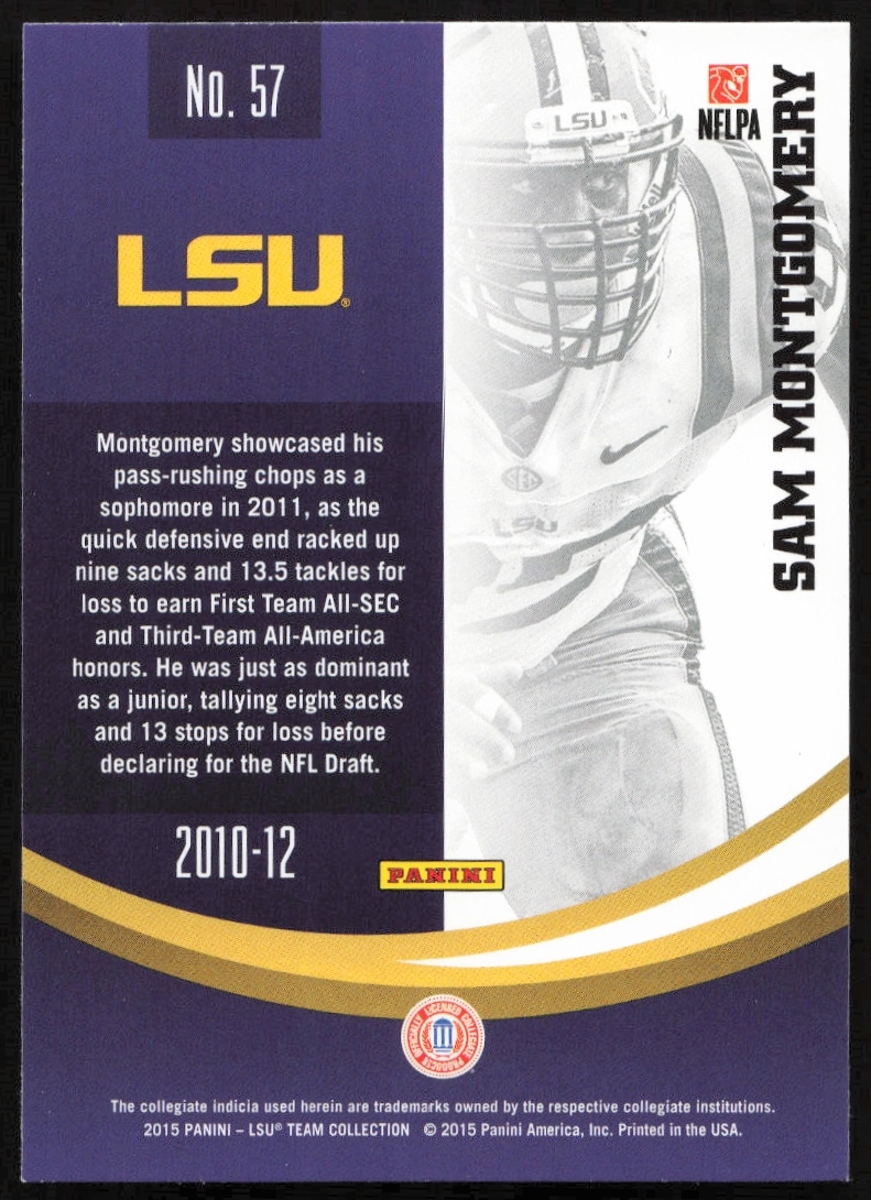 This Football card, from 2015 is part of the Panini LSU Tigers card set. Sam Montgomery is featured and has a card number of 57.