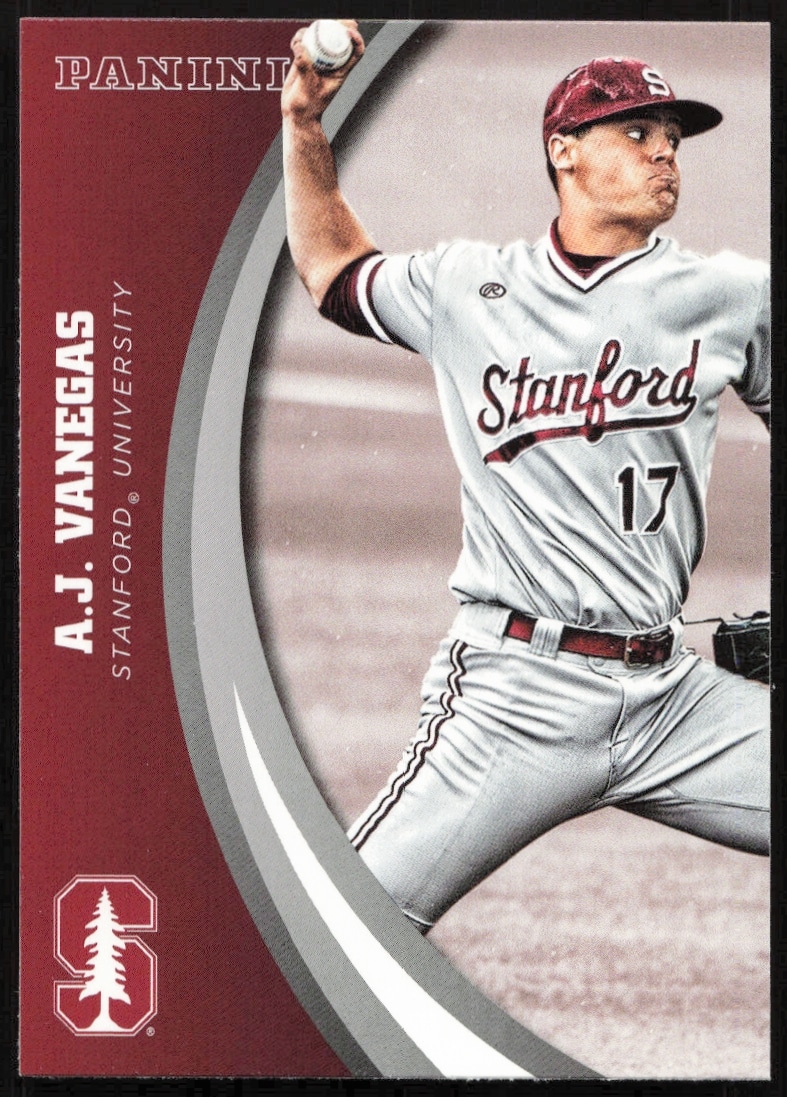 This Baseball card, from 2015 is part of the Panini Stanford University card set. A.j Vanegas is featured and has a card number of 20.