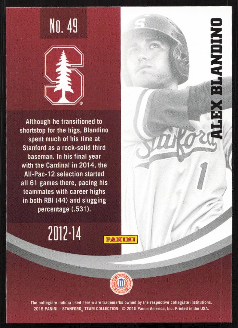 This Baseball card, from 2015 is part of the Panini Stanford University card set. Alex Blandino is featured and has a card number of 49.
