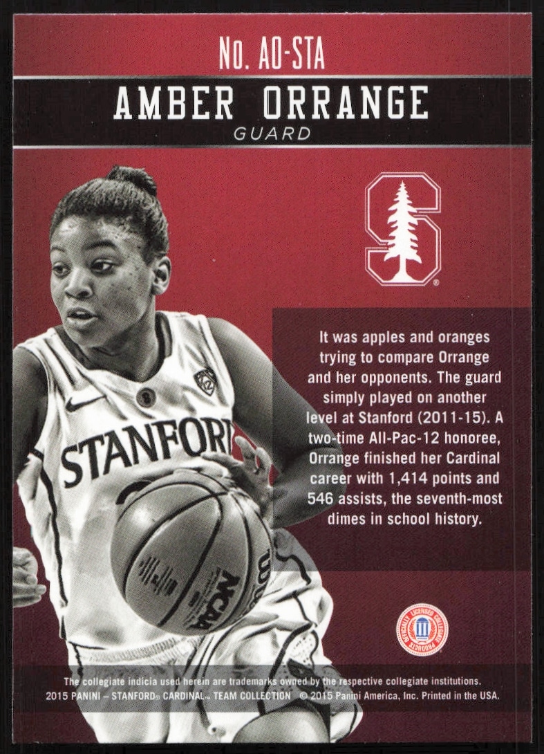 This Basketball card, from 2015 is part of the Panini Stanford University card set. Amber Orrange is featured and has a card number of AO-STA.