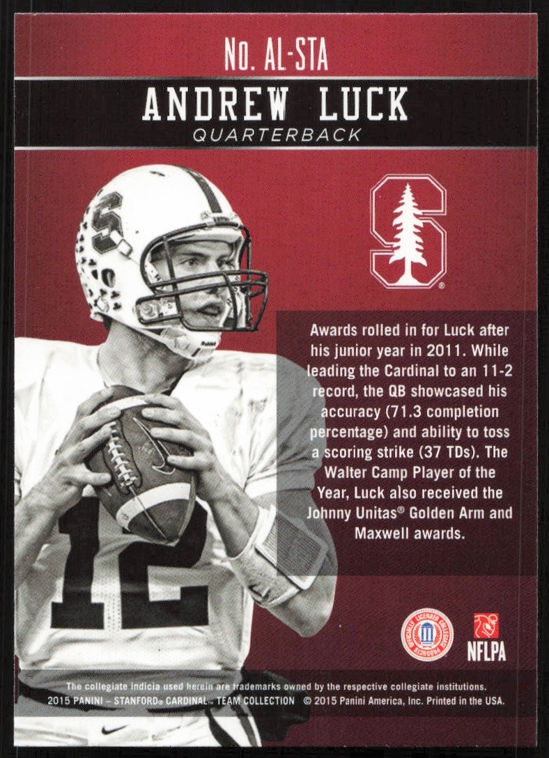 This Football card, from 2015 is part of the Panini Stanford University card set. Andrew Luck is featured and has a card number of AL-STA.