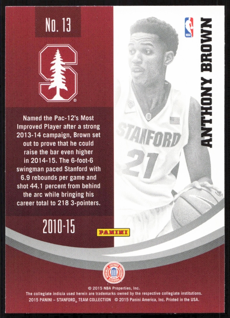 This Basketball card, from 2015 is part of the Panini Stanford University card set. Anthony Brown is featured and has a card number of 13.