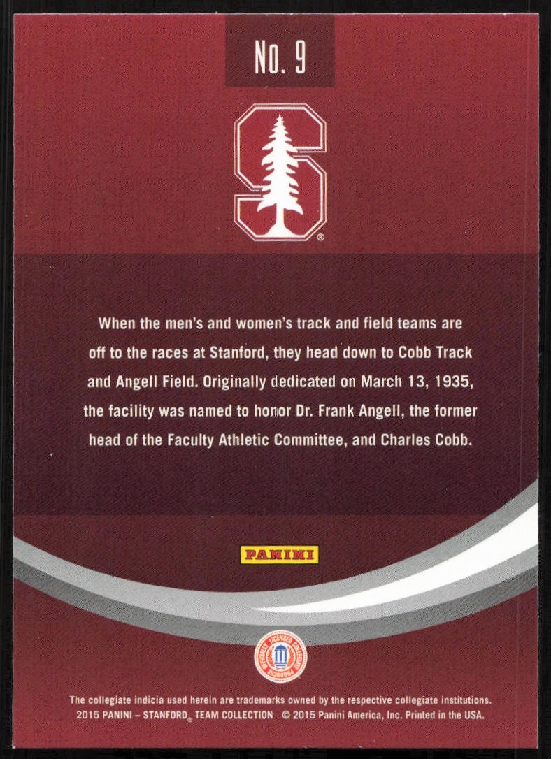 This card, from 2015 is part of the Panini Stanford University card set. Cobb Track And Angell Field is featured and has a card number of 9.